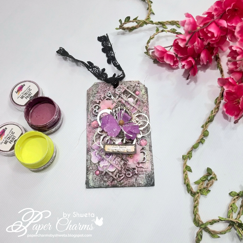 Then applied Velvet Orchid metallic paint on the tag. Diluted it with some water to help move it easily.